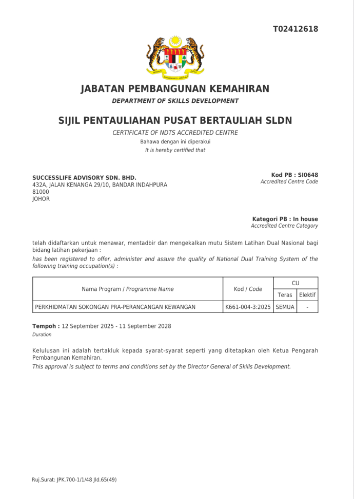 SuccessLife Advisory Sdn Bhd 很荣幸获得马来西亚技能发展局(JPK,Jabatan Pembangunan Kemahiran)的认证。我们与 JPK 合作,为学员提供考核与认证,以取得马来西亚技能证书(SKM,Sijil Kemahiran Malaysia)第三级文凭。